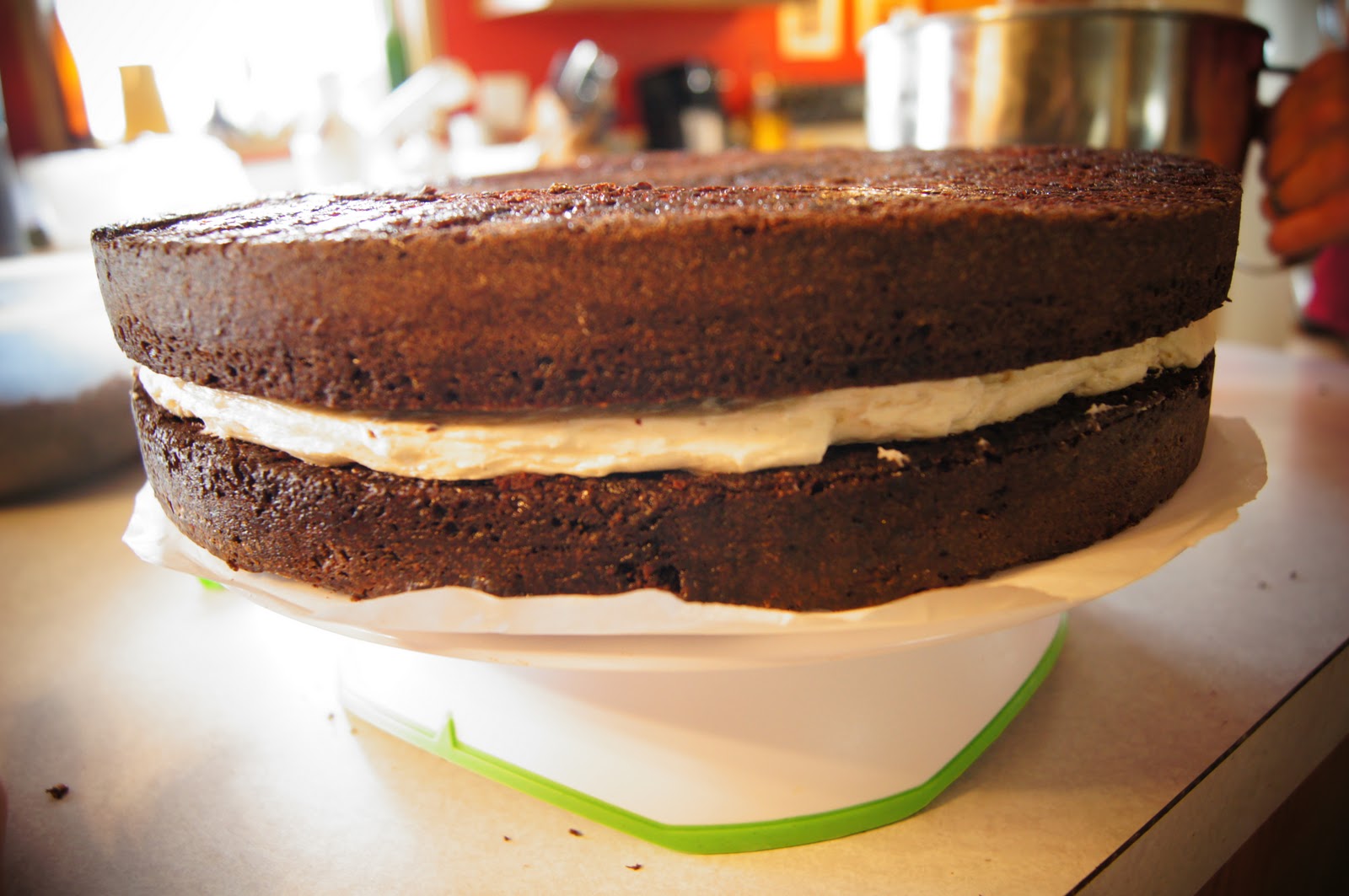 For the cake I made my dark chocolate, chocolate chip cake. Since I originally wasn’t sure how I was going to construct the cake, I made several different batches in various bowls and pans, so the Hubby went to town on the leftovers. Sure makes a lady feel good to have her man devouring her recipes!