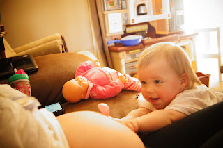When I asked Gwyneth last night if she was going to feed her baby dinner, as she loves to do with her baby dolls, she did take a plastic bowl and fork, lift up my shirt and try to spoon-feed my stomach through my belly button. I couldn’t help but laugh and joined in making the appropriate chewing and slurping sounds.