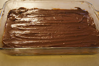 2.) Melt 1 1/4 cups of chocolate chips with 1/4 cup of peanut butter. You can do this in a saucepan over the stove, or in the microwave. I chose the microwave and melted the ingredients on high for 30 second intervals, stirring in-between each interval.  Evenly spread the mixture on the bottom of the baking dish and let cool and completely harden.