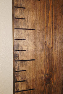 I then taped my stencils on the board next to the appropriate lines. NOTE: This is where I ultimately messed up. I wanted my board to look as much like a ruler as possible, and it wasn’t until I was finished that I realized that I taped my numbers on wrong. Instead, they should be tapedย perpendicularย to the board.