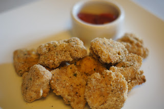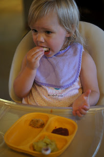 5:40- Give Gwyn dinner. Chicken nuggets and pureed sweet potatoes. I snack on dinner too.