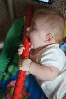7:20- Warm bottle for Cal and feed. Hubby eats dinner. Gags on pureed sweet potatoes. I laugh. I too gagged. Kindof gross that pureed. Play with Cal.