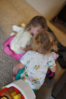 11:20-12:00 Play with toys. Gwyn and her friend continually want each other’s toys. Lots of “learn to share” phrases are expressed. Snack of oranges and granola bars.