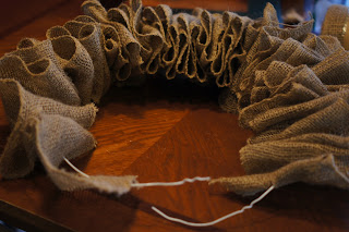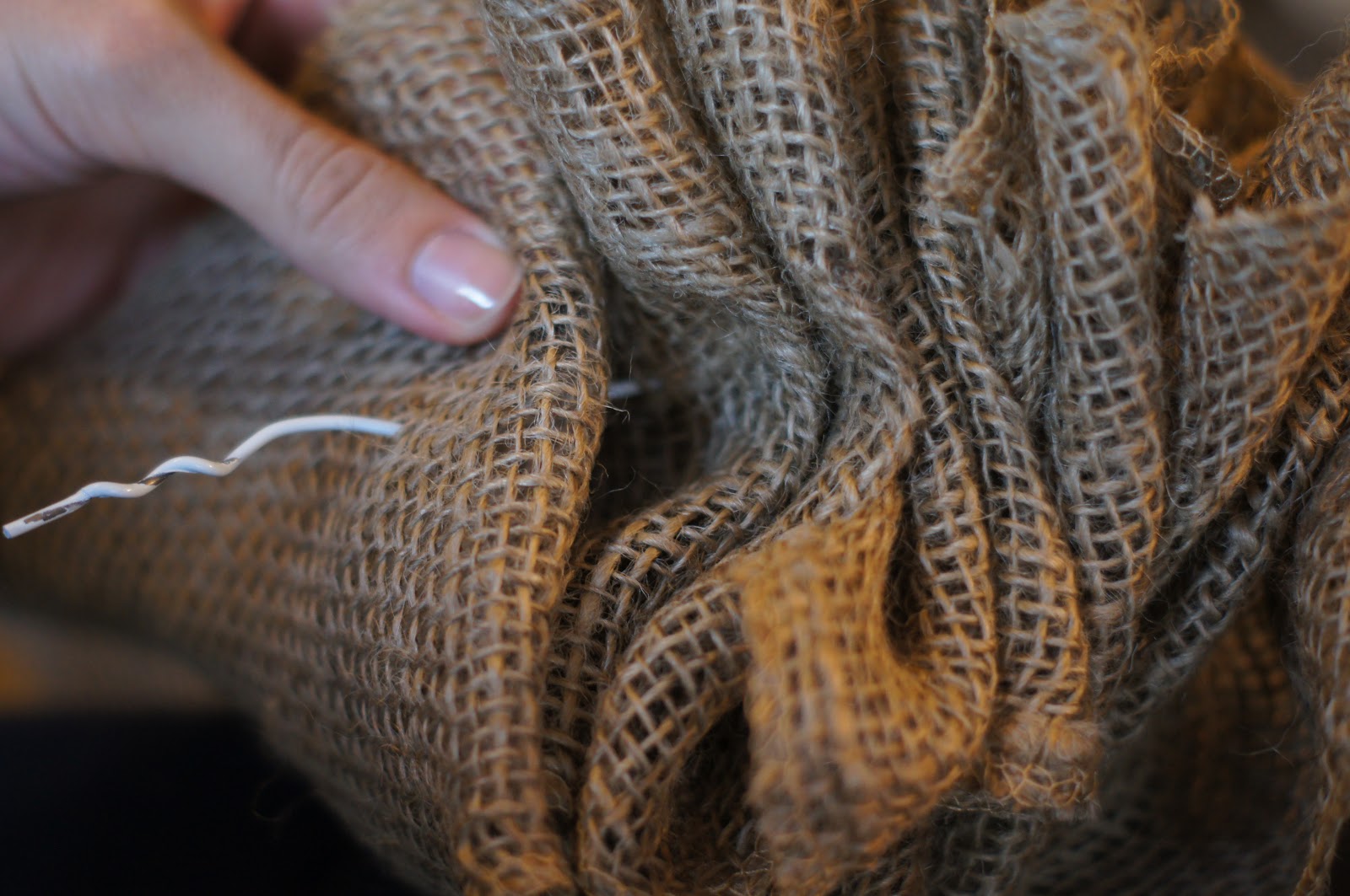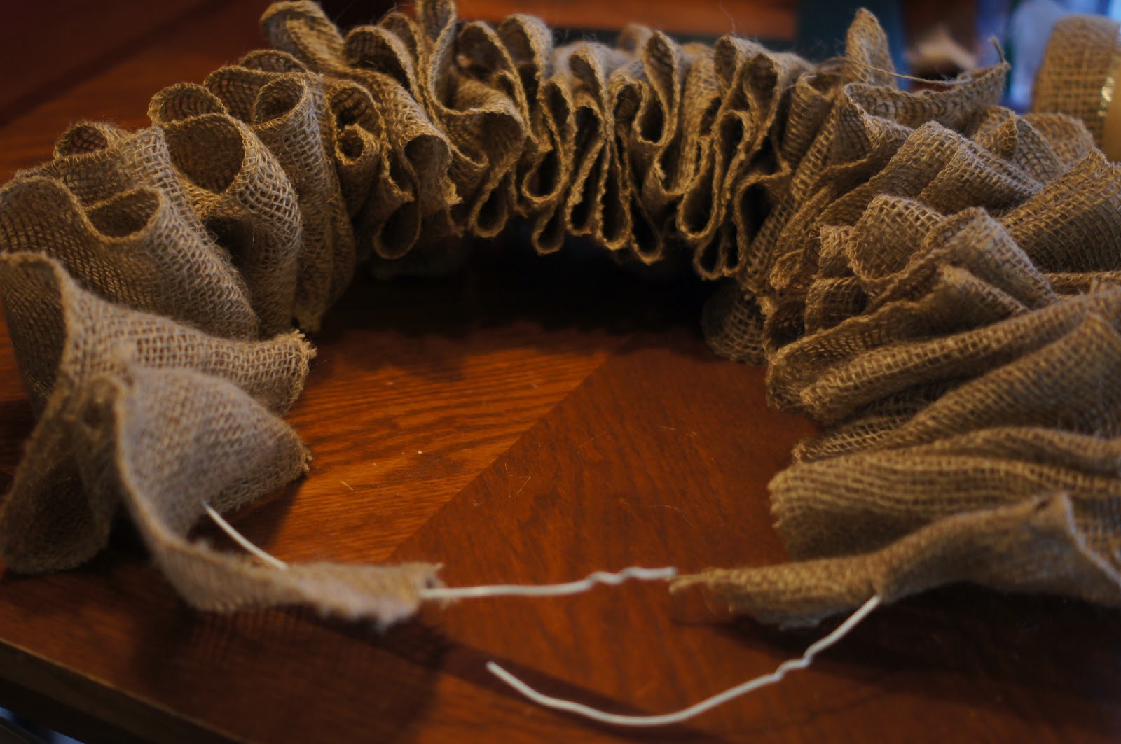 Then, try your best to twist the wire back together on the circle, closing it up. I then cut about a 5″ strip of light burlap from the 1/2 yard that I purchased and made a bow and attached it with a safety pin. I also cut another 3″ strip to hang the wreath from the top of my door.