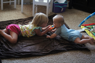 3:30- Cal wakes up but just chills in swing while Gwyn and I play “dragon hunting” around the house. This consists of searching rooms for dragons, tip-toeing around and then running away screaming once they’re found.