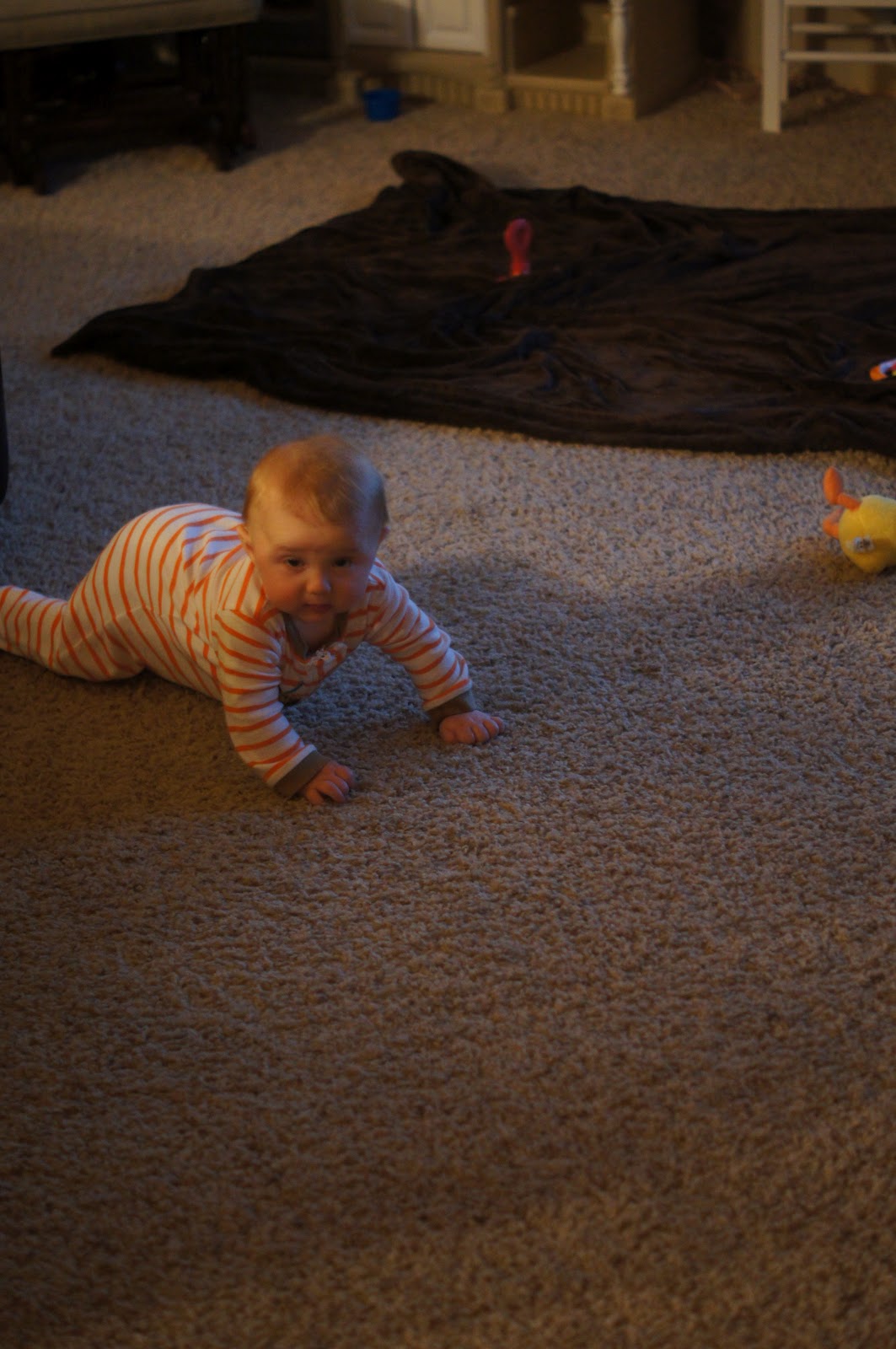 7:00- Brush Gwyn’s teeth, look over and see Cal making his way toward us. He was previously on the blanket. Sneaky little thing.