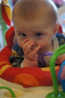 6:05-Cal is done in the Bumbo so I change his diaper while singing the ABCs as it seems Witching Hour has begun.
