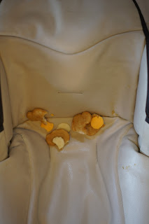 12:55-Cal and Gwyn are both ready for lunch. Gwyn gets Mickey Nuggets and Mickey Cheese. Cal, squash. Gwyn begs for a sip of my drink (which is decaf) and I tell her when she finishes her lunch she can have a sip. So when she shows me her cleared plate, I give her a sip and get her down. And this is what I find behind her back in her seat.