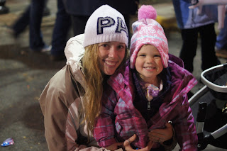 Once we got there, we ordered a hot chocolate and coffee and found the perfect spot next to some friends right in the front row. Gwyn really had a wonderful time. It was past her bed time and she knew it. She was waving to the people on the floats, running out to get candy, and yelling hello to everyone who passed.