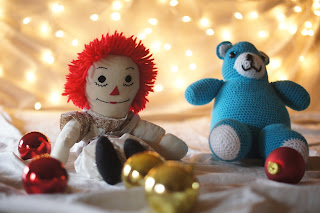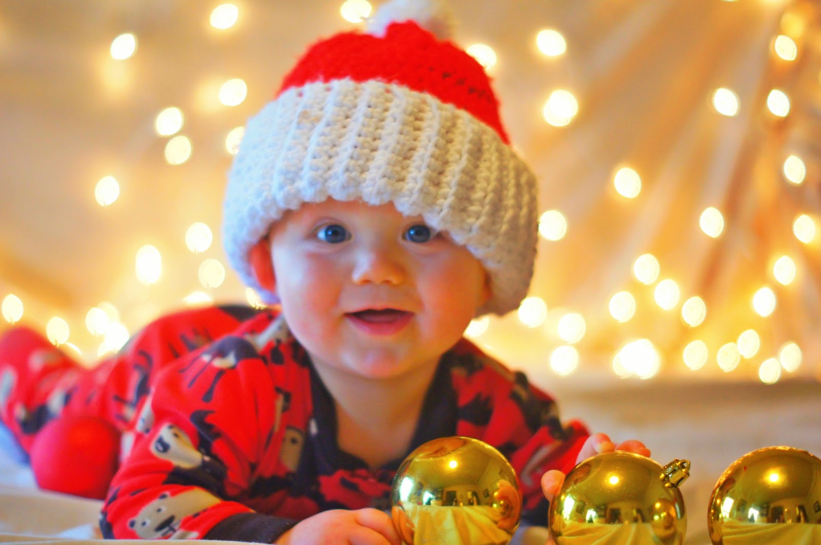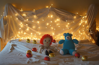 To hide the headboard I draped our cream-colored bed sheet over it and then strung the icicle lights across, draping one behind the headboard toward the middle so that the strand wouldn’t droop too much. I ruffled up the fitted sheet so that it wasn’t too tight and had a softer feel, placed the ornaments sporadically on the bed (they will not stay where you originally intend with REAL children, so don’t spend too much time here) and then used two “prop children” to take a few practice photos.