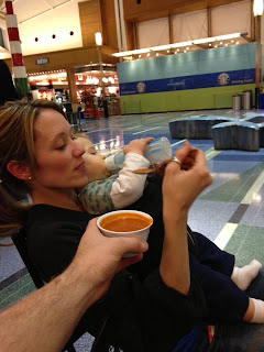 So we waited. And waited. And the plane became stuffy. And then of course Cal woke up sweaty as ever and not very happy. The Hubby tried his best to rock him back to sleep, but of course he wanted his Mama.