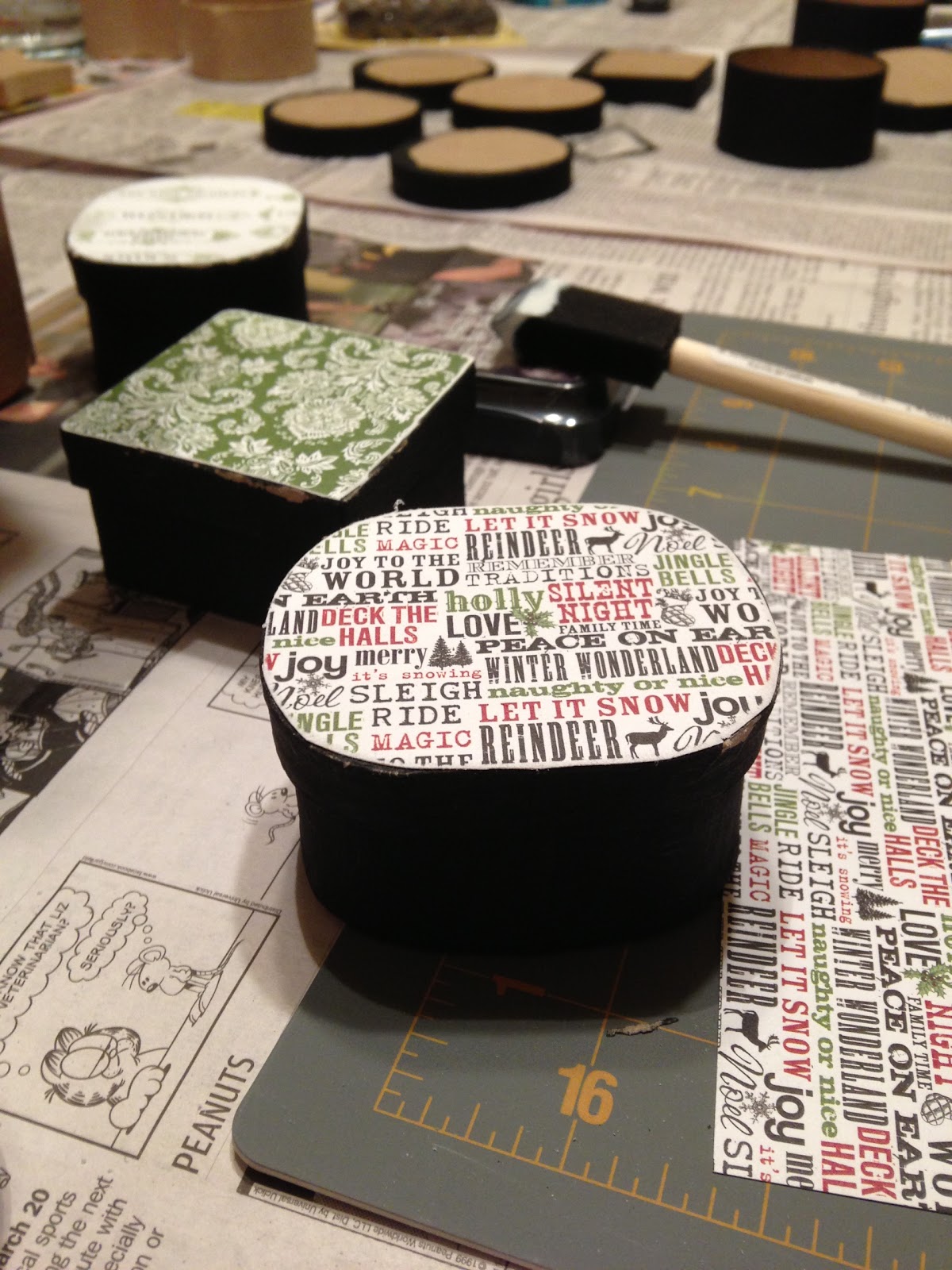 Next we painted a final coat of Mod Podge over the tops of the boxes to seal it all in.