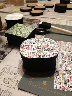 Then, we mod-podged the paper to the lids of the boxes: First, spread a thin coat of mod podge using a foam brush over the lid, and then place your lid flat side down on the back of your desired paper. Then, cut around the lid with your utility knife/box cutter so that the paper is now attached to your lid.