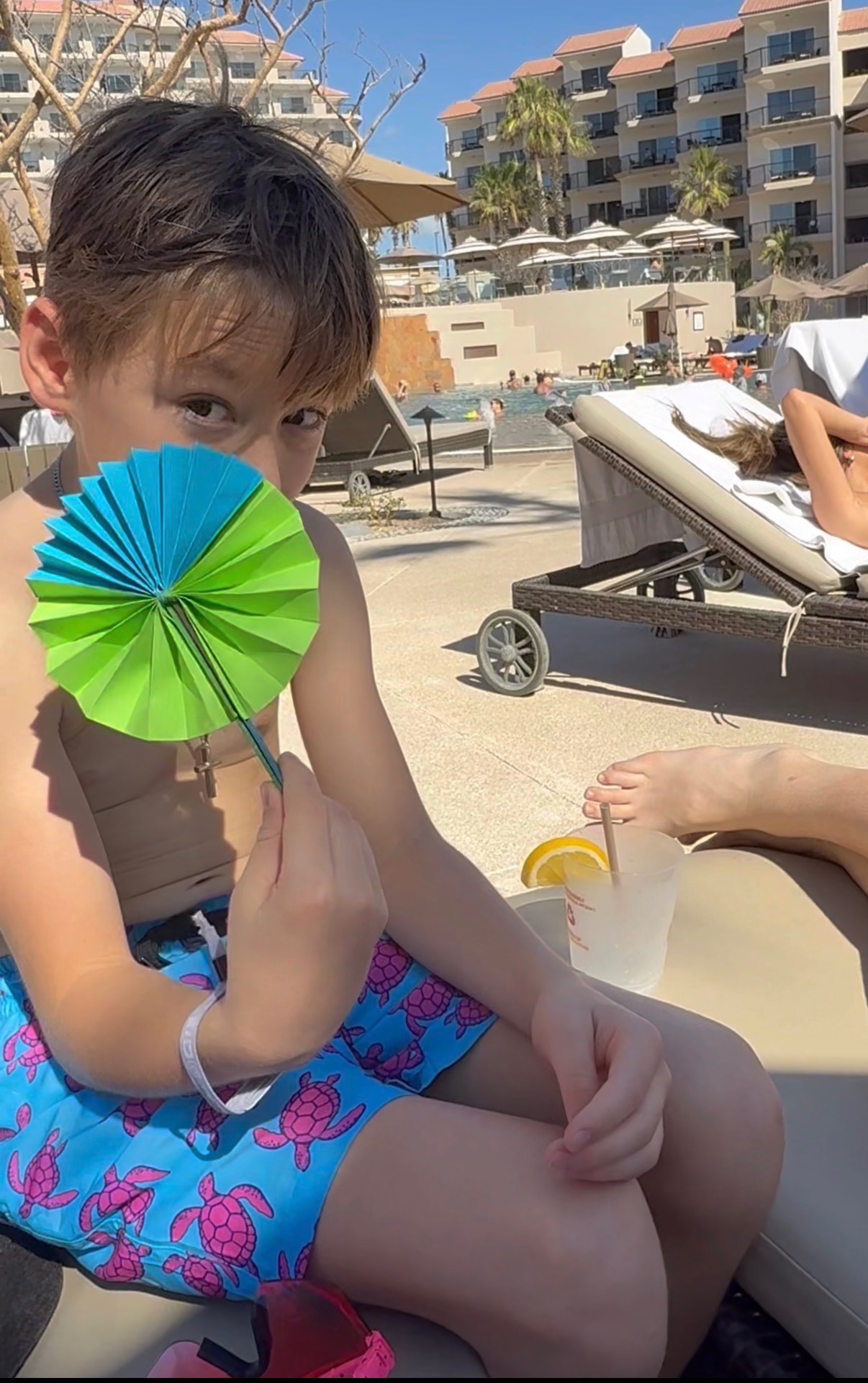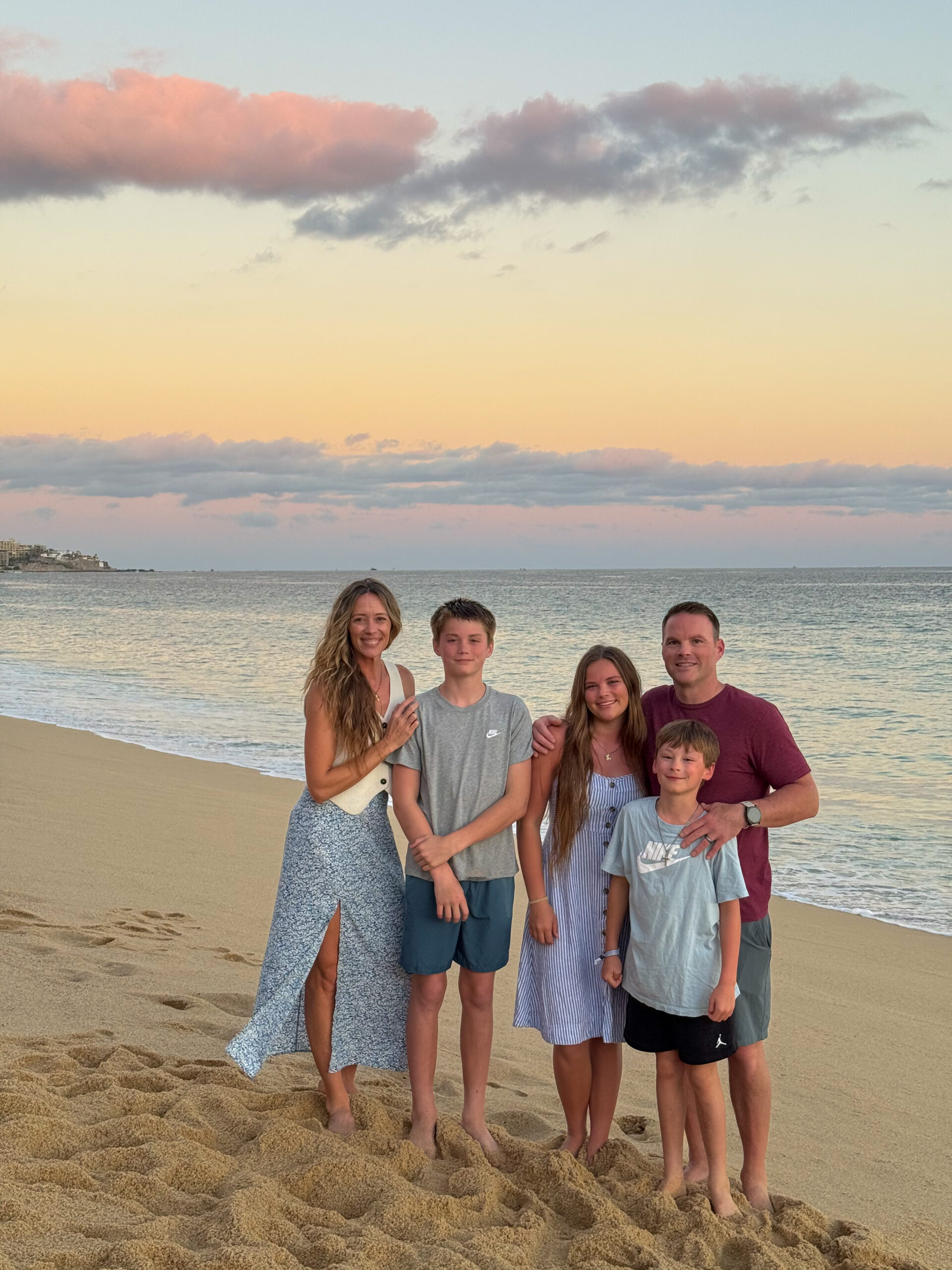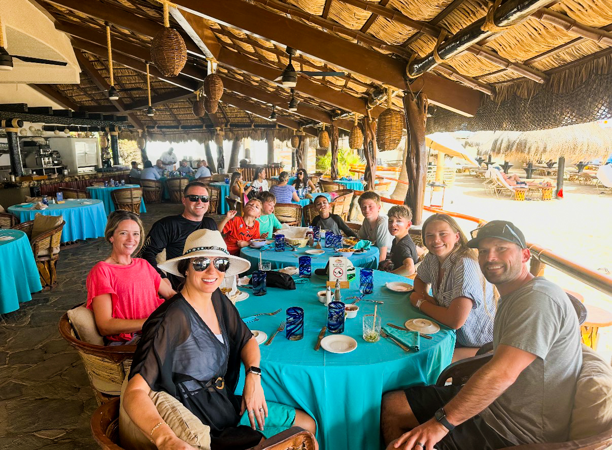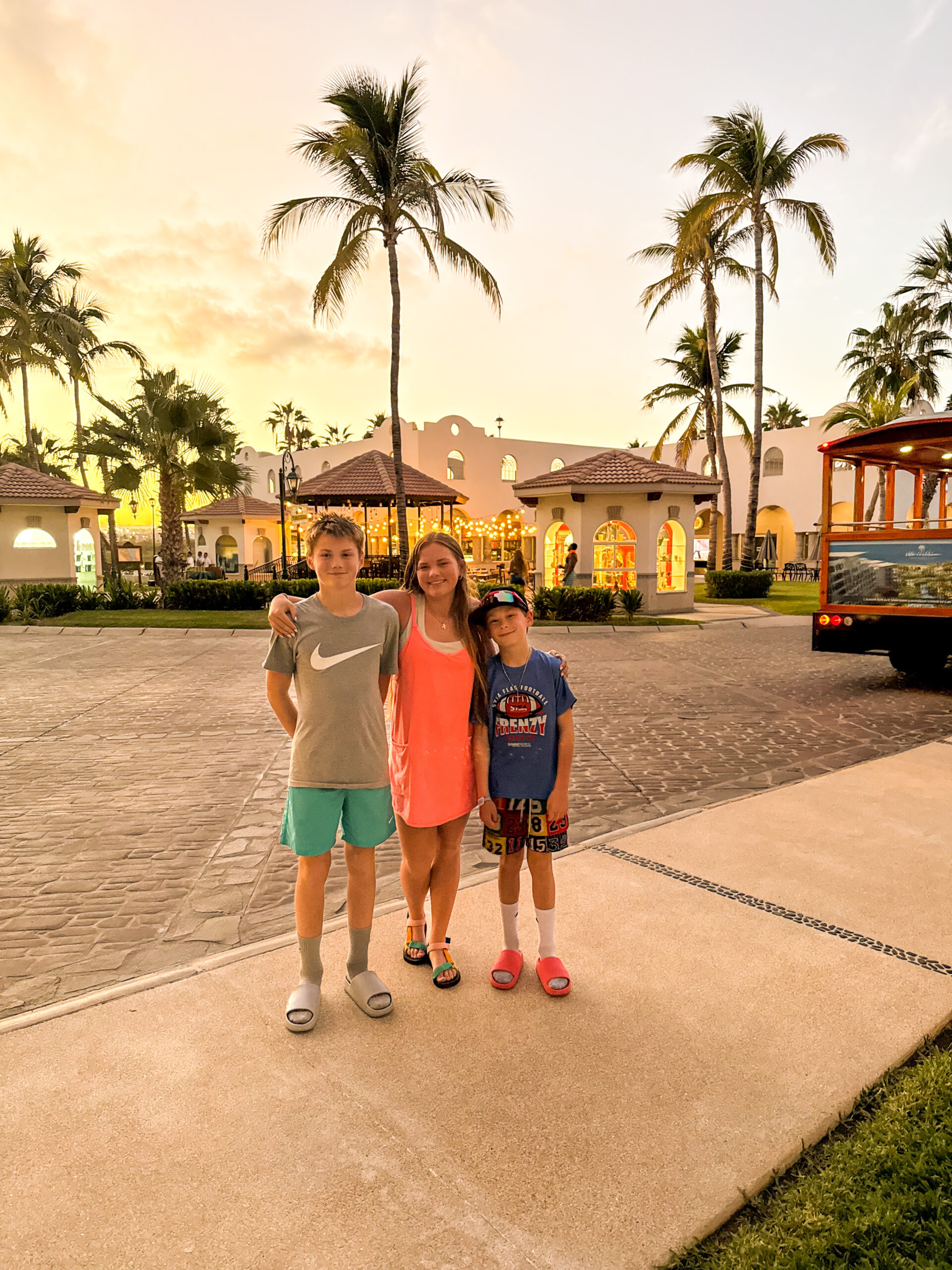 We stayed at Villa del Palmar in Cabo, about eight minutes from downtown, and it’s a place we’ve stayed 3–4 times now. I originally found this hotel through a Costco special, and the family-friendly atmosphere was what kept us coming back. I liked that it was far enough from the main strip to avoid the college party scene, yet still walkable when we wanted to head to the beach. They offered several room options, which worked well for our family since we needed the space. We had a two-bedroom condo, so J and I had a room, Gwyn had a room, Cal had the pullout couch, and we got a rollaway bed for Franklin. With growing teens, having their own space was incredibly nice and kept everyone happy.