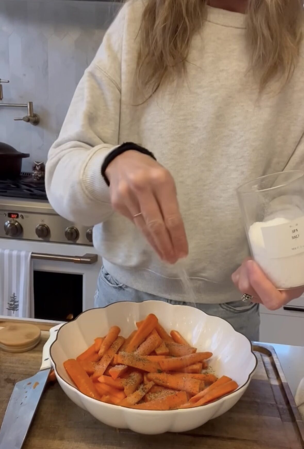 - In a large bowl, coat the carrots with olive oil and mix in garlic powder, salt and pepper.