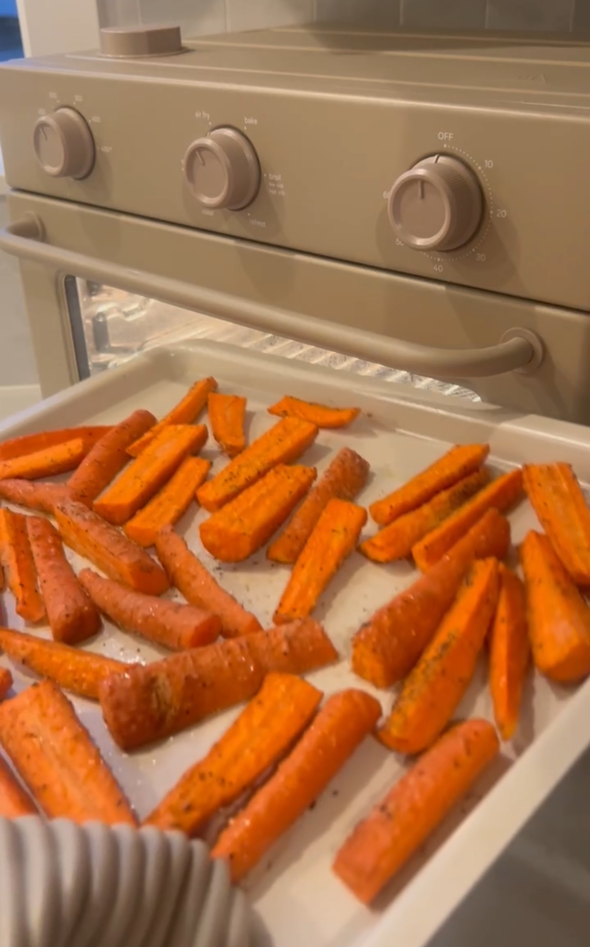 3. Spread the carrots in a single layer on the baking sheet, cook in air fryer at 375 for 15-20 minutes or until you reach your preferred level of doneness.