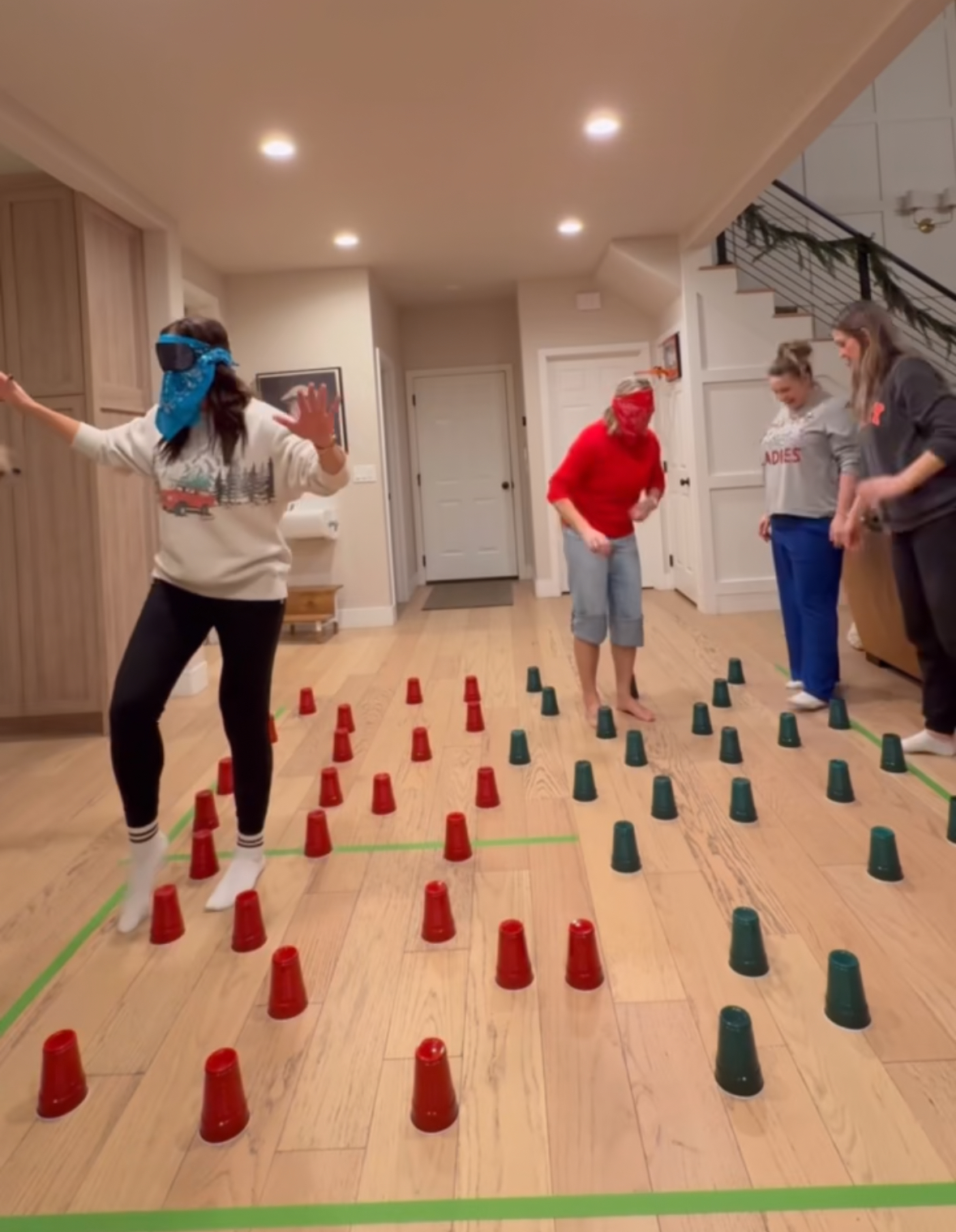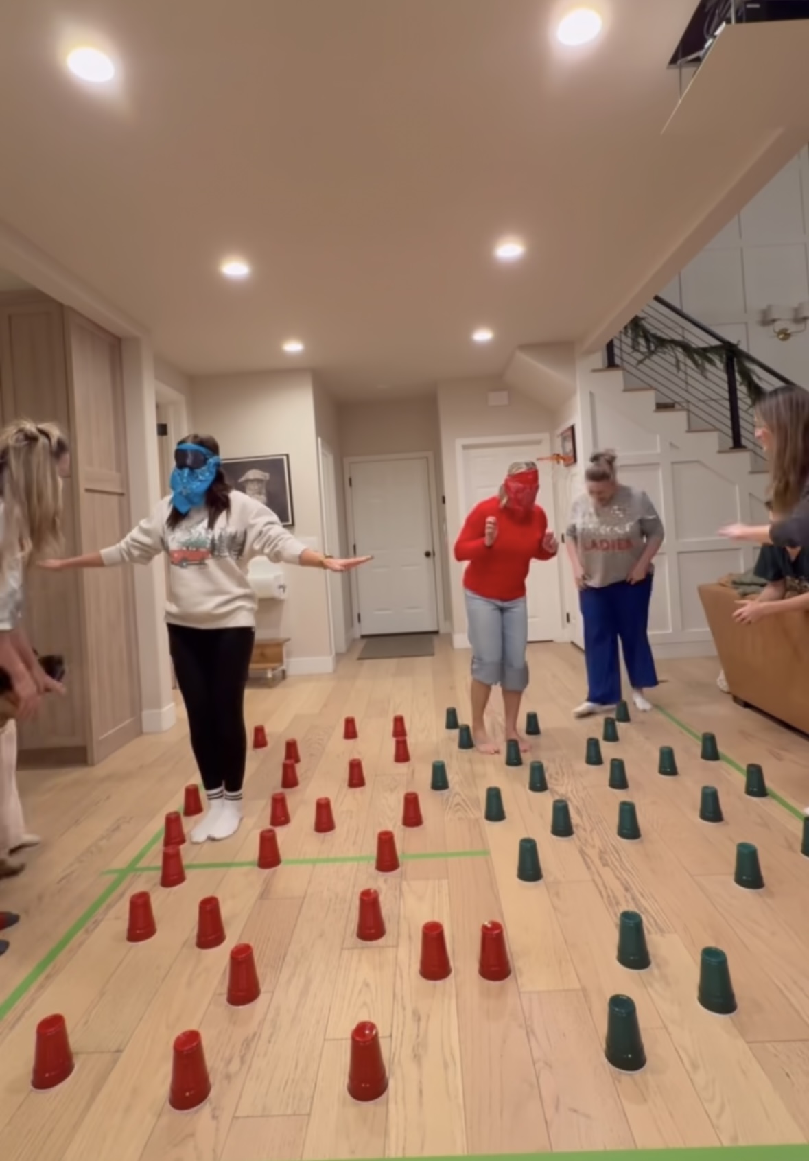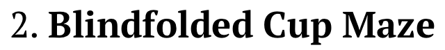 Cups are sporadically placed on the ground, spanning about 10 feet. Teams must verbally guide a blindfolded teammate through the maze of cups. If the teammate touches a cup, they must start over. The first team to reach the end wins.
