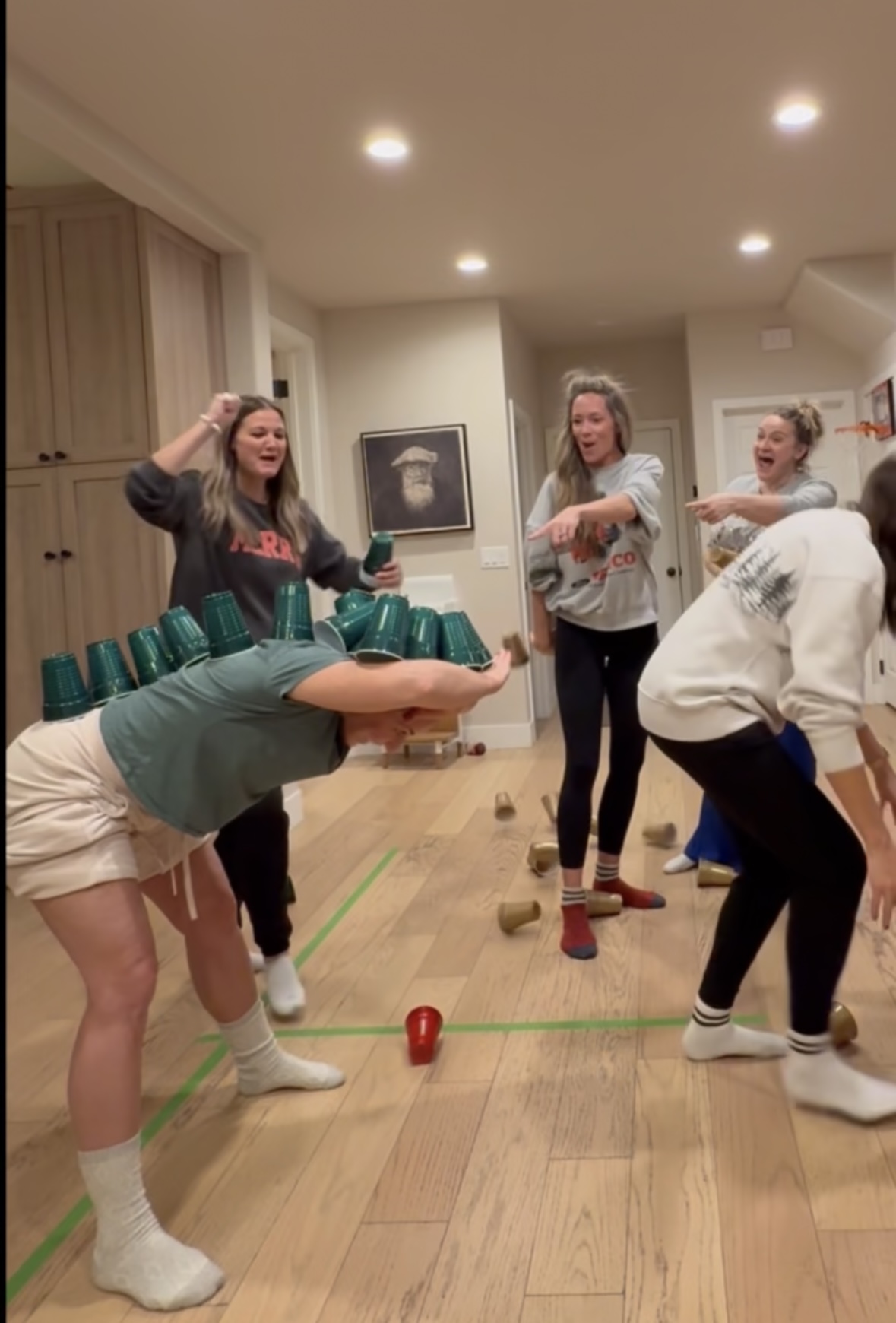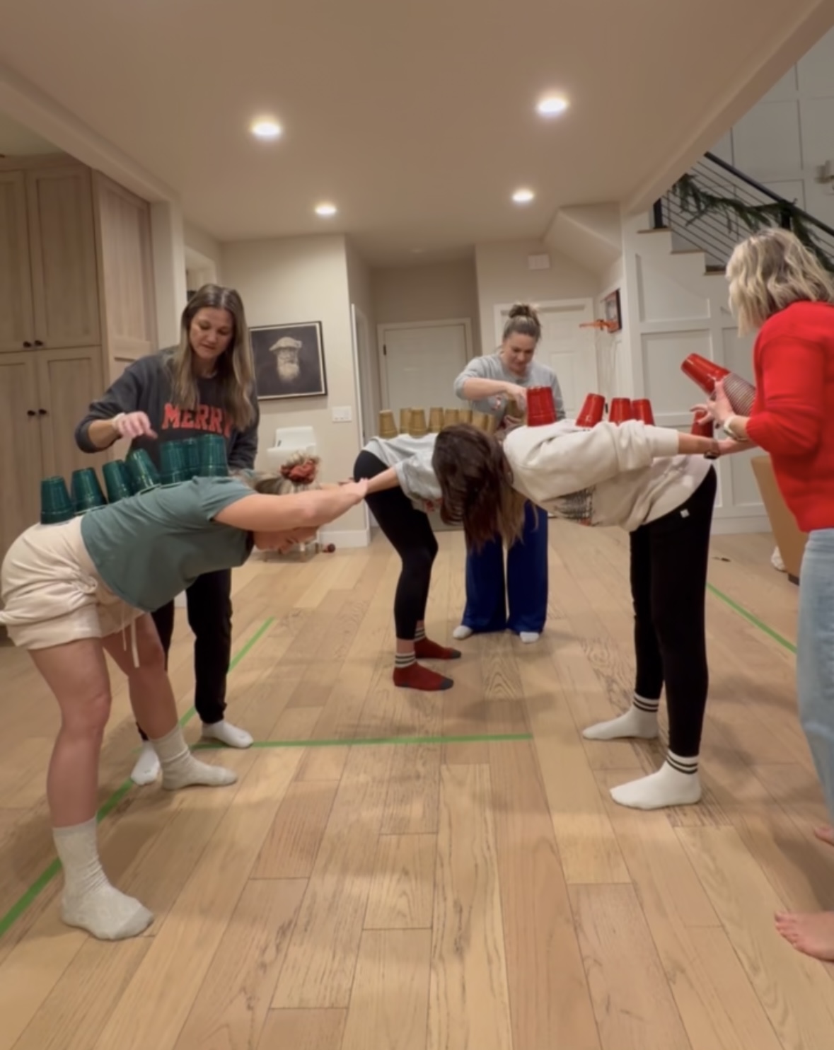 Each team has one minute to stack as many cups on their teammate as possible. You cannot stack the cups on top of each other-whichever team has the most cups at the end of 60 seconds wins.