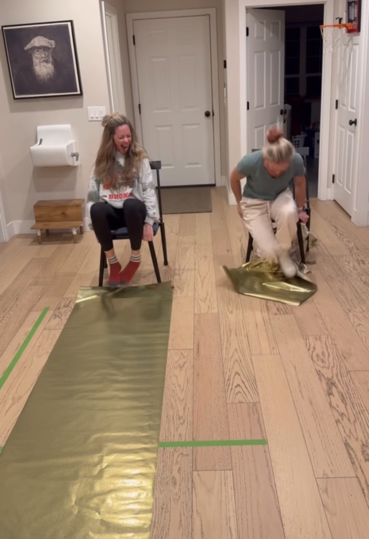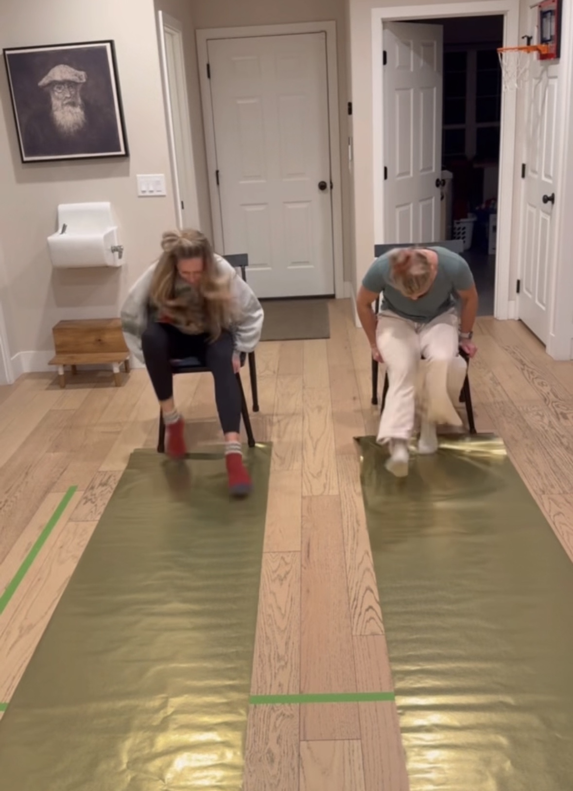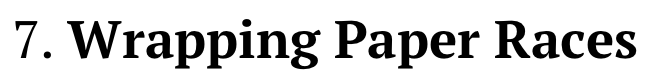 Two players sit side by side in chairs with a long strip of wrapping paper placed on the floor in front of them. Using only their feet, no hands allowed, they race to move the paper toward themselves. The first person to reach the end of the paper wins.