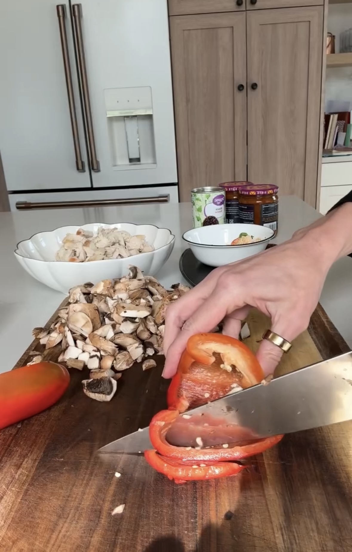 3. While the chicken cooks, chop the broccoli into small florets, dice the bell pepper, and slice the mushrooms.