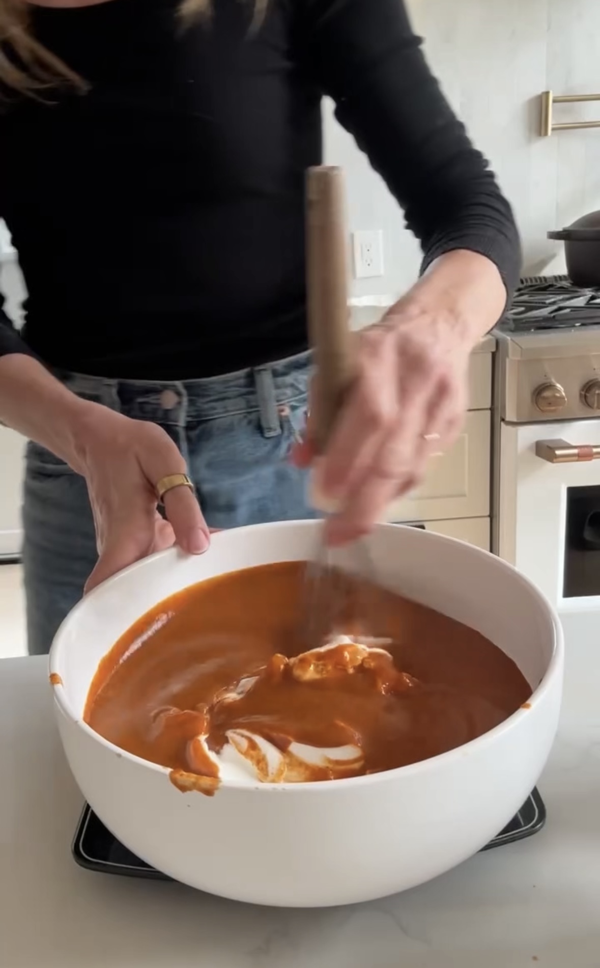 4. In a large bowl, whisk together the enchilada sauce and Greek yogurt until smooth and creamy. Season with salt and pepper to taste.