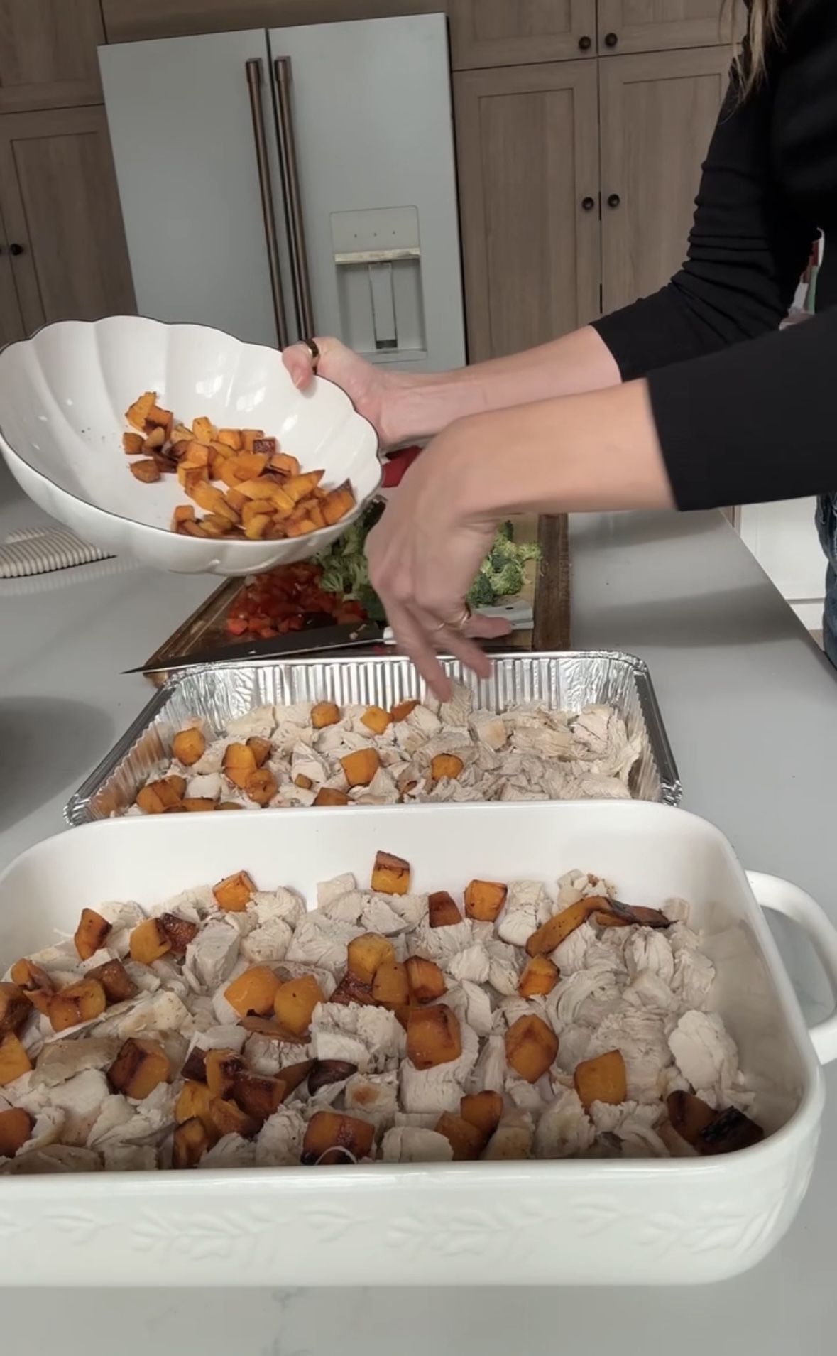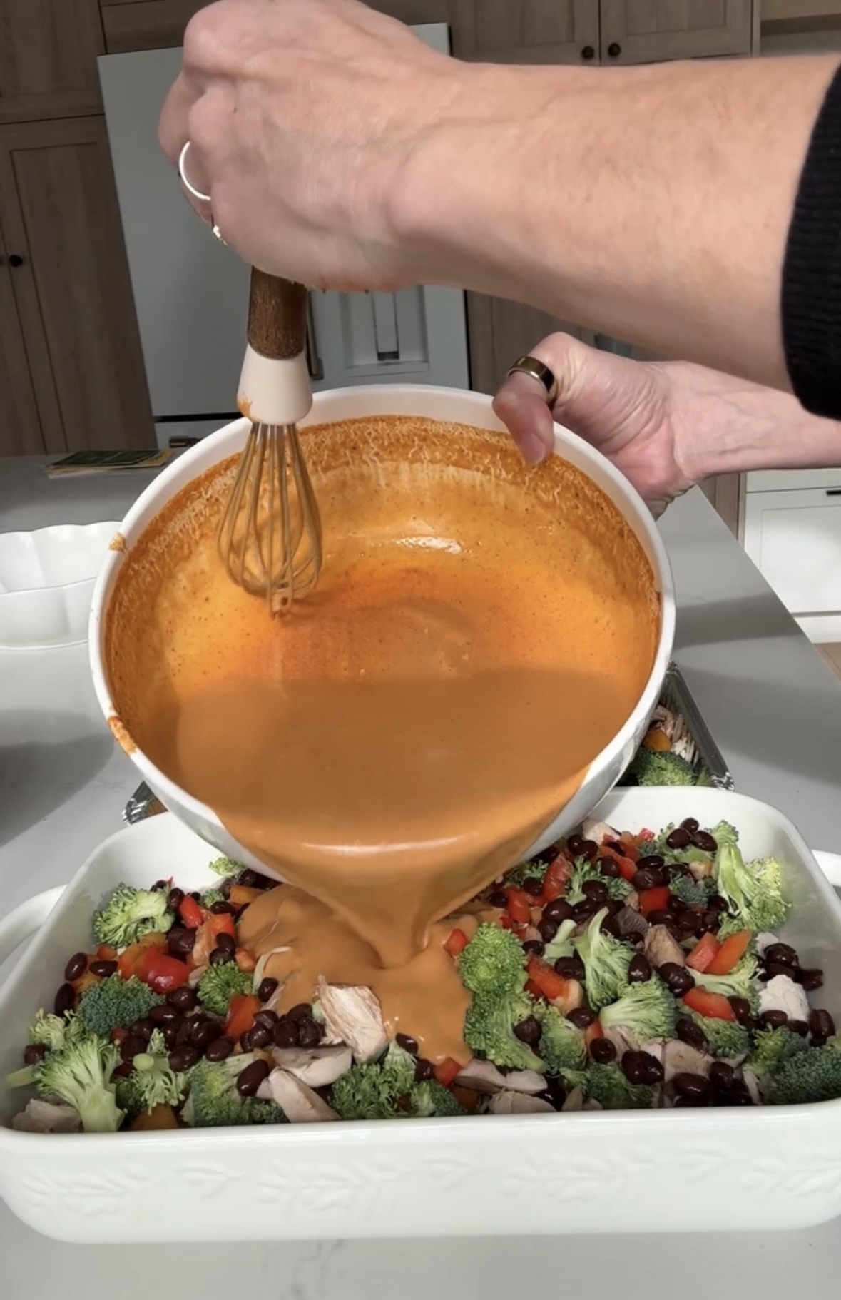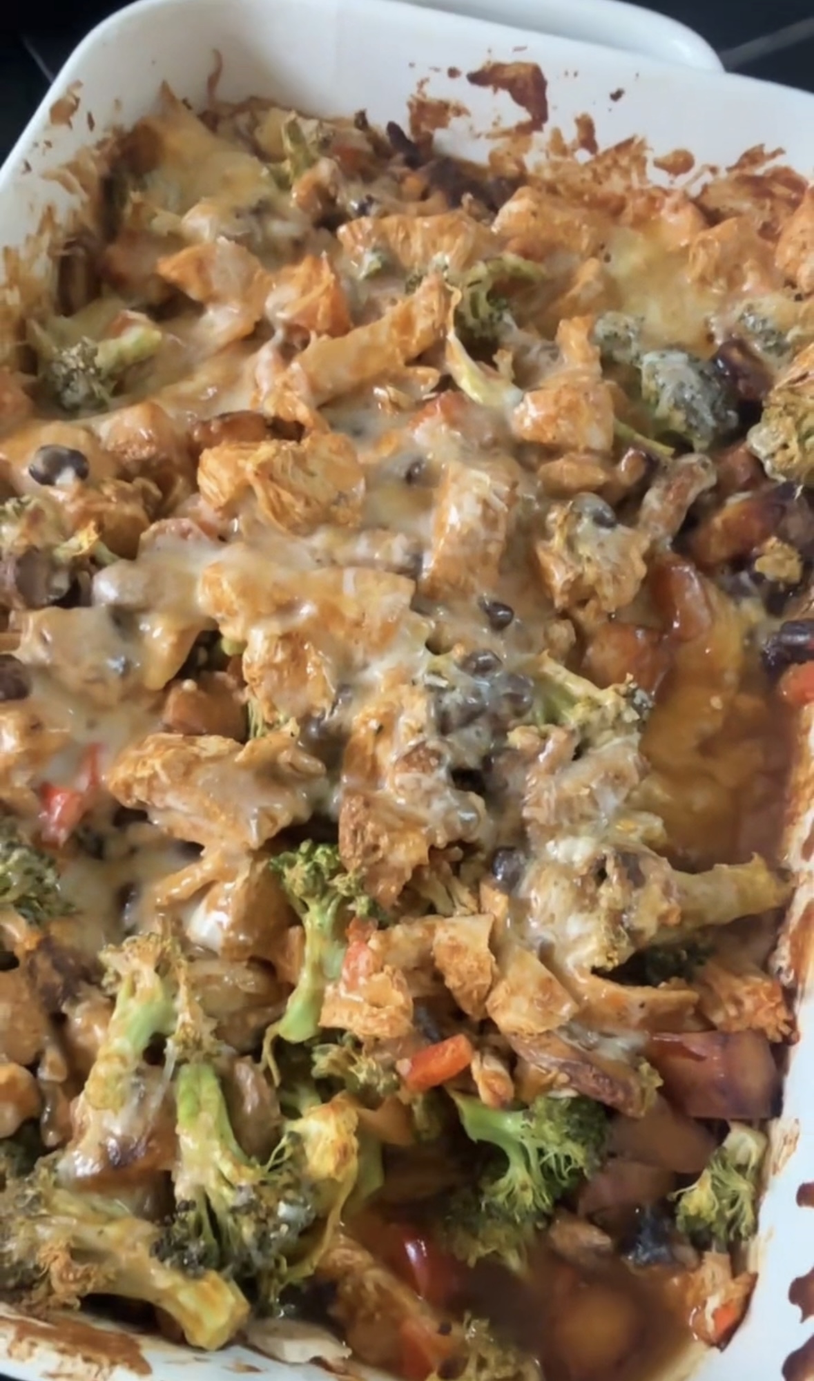 5. In a large 9×13 inch casserole dish, combine the shredded chicken, roasted squash, broccoli, bell pepper, mushrooms, and black beans. Pour the enchilada sauce and yogurt mixture over everything and mix well to ensure all ingredients are coated. Spread mixture evenly in the dish.