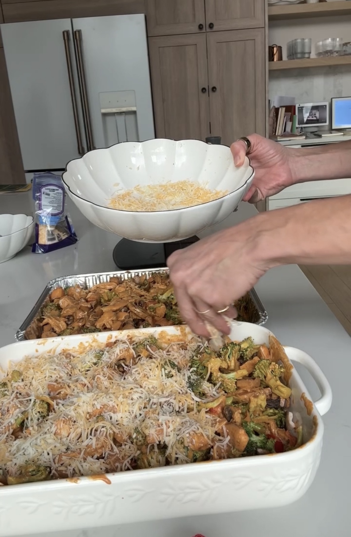 6. Top with the shredded cheddar cheese. Cover the casserole dish with foil and bake for 25 minutes. Remove foil and bake for an additional 10-15 minutes until cheese is melted and bubbly and vegetables are tender.
