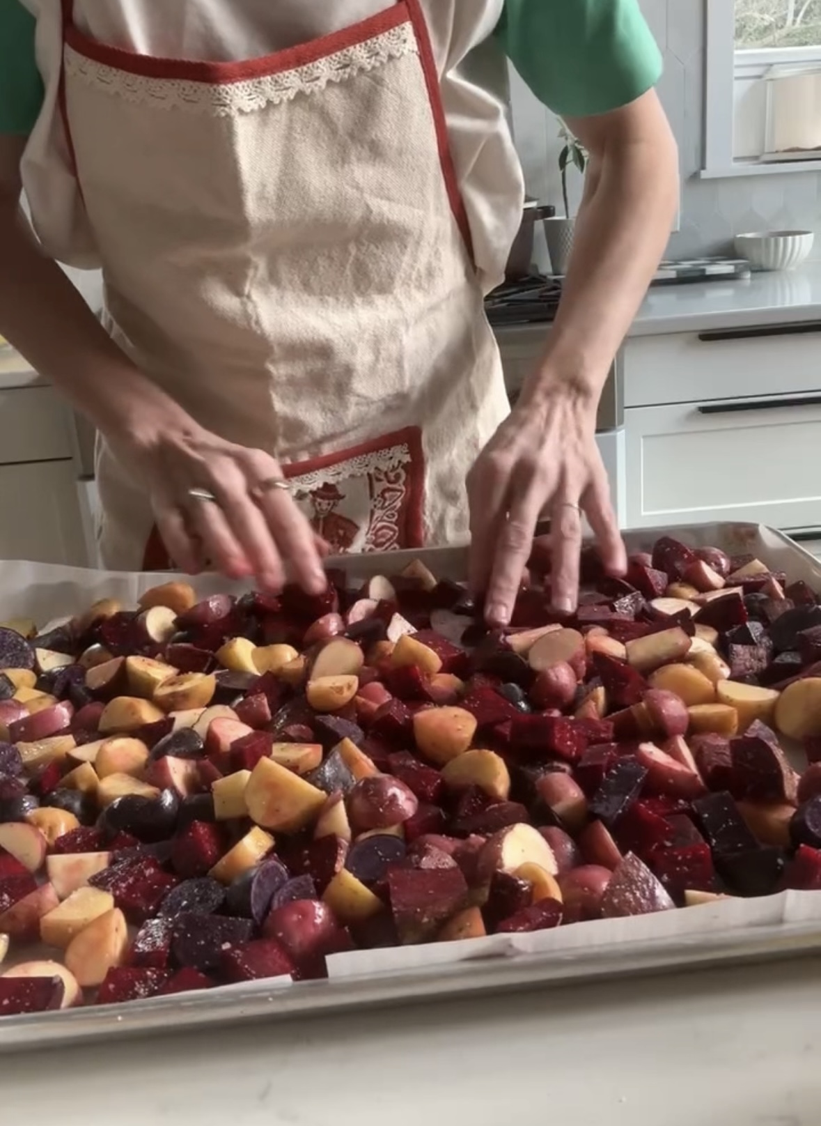 1. Preheat the oven to 400°F (200°C). Dice the potatoes and beets into small, even-sized pieces to ensure they cook evenly. Toss them with cooking oil, salt, and pepper, then spread them on a baking tray. Roast for 25-30 minutes, flipping halfway, until golden and tender.