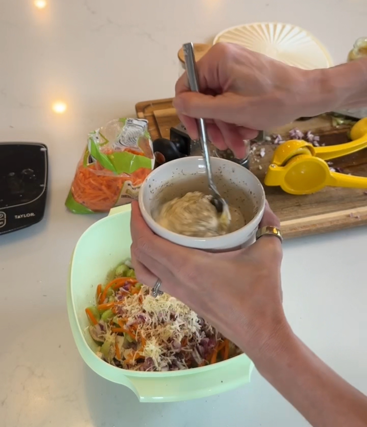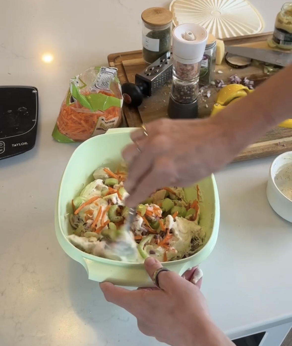 - Shred (or dice) the cooked chicken breast and place it in a bowl. Add diced celery, grated carrot, diced red onion, lemon juice and season with salt and pepper, mix to combine.