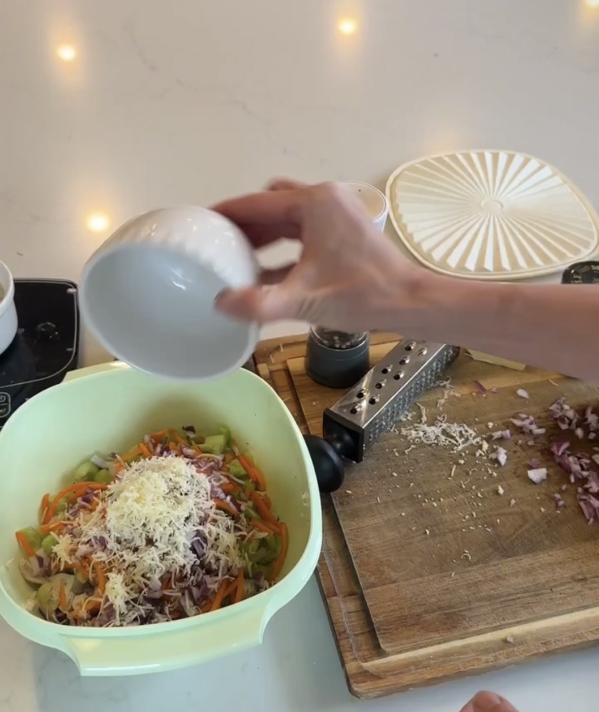 - In a separate bowl, mix together the greek yogurt, grated cheese, dijon mustard, garlic powder, salt, pepper, lemon juice and parsley until smooth.