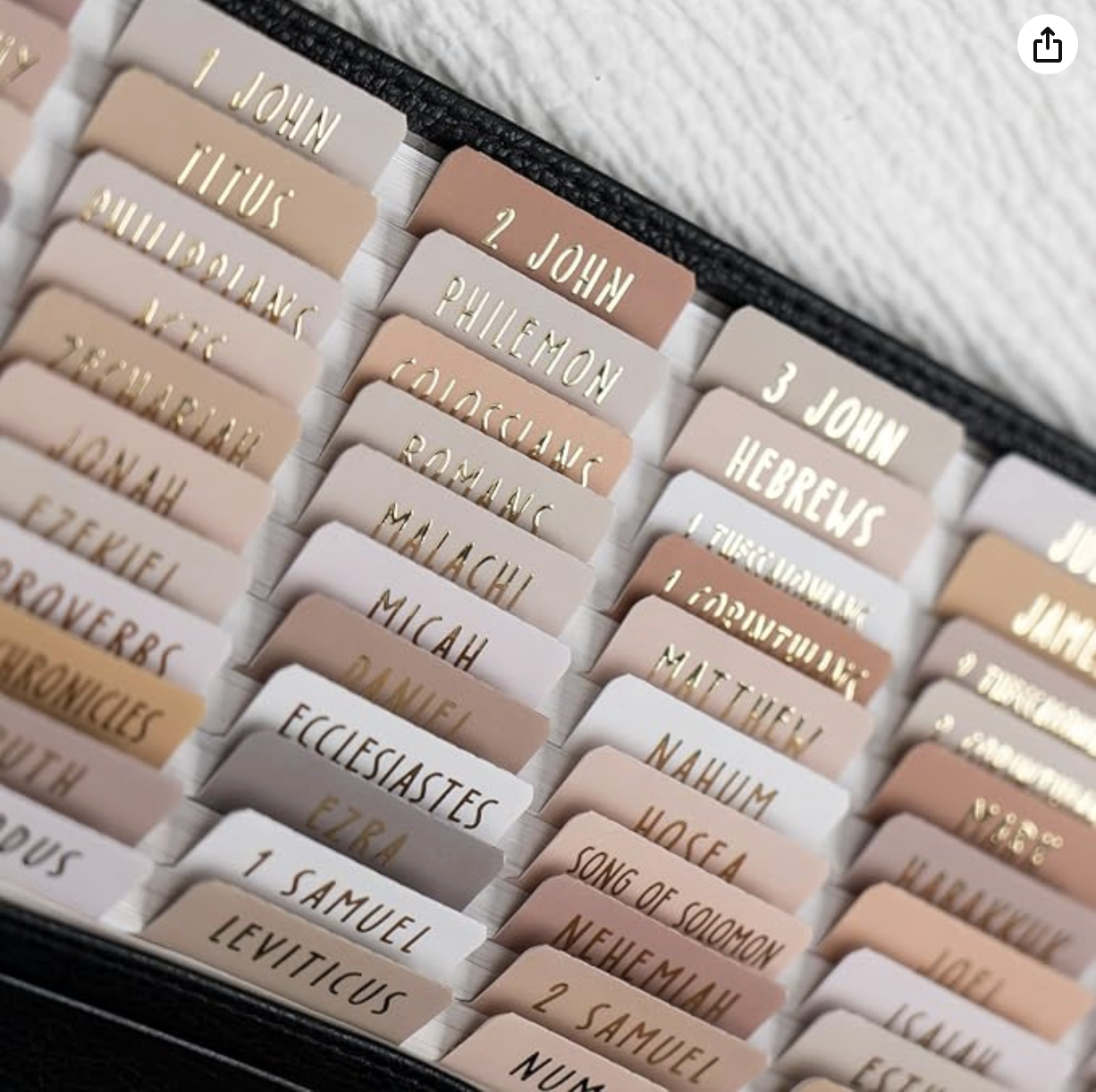 A while back Gwyn added tabs to her Bible to make each section easier to find and I always wanted it done to mine, too, so Gwyn went ahead and did that for me as well. To make sure the tabs are evenly spaced, Gwyn developed a “template” by marking an index card with the correct spacing, and then used that to place the tabs as she went along.
