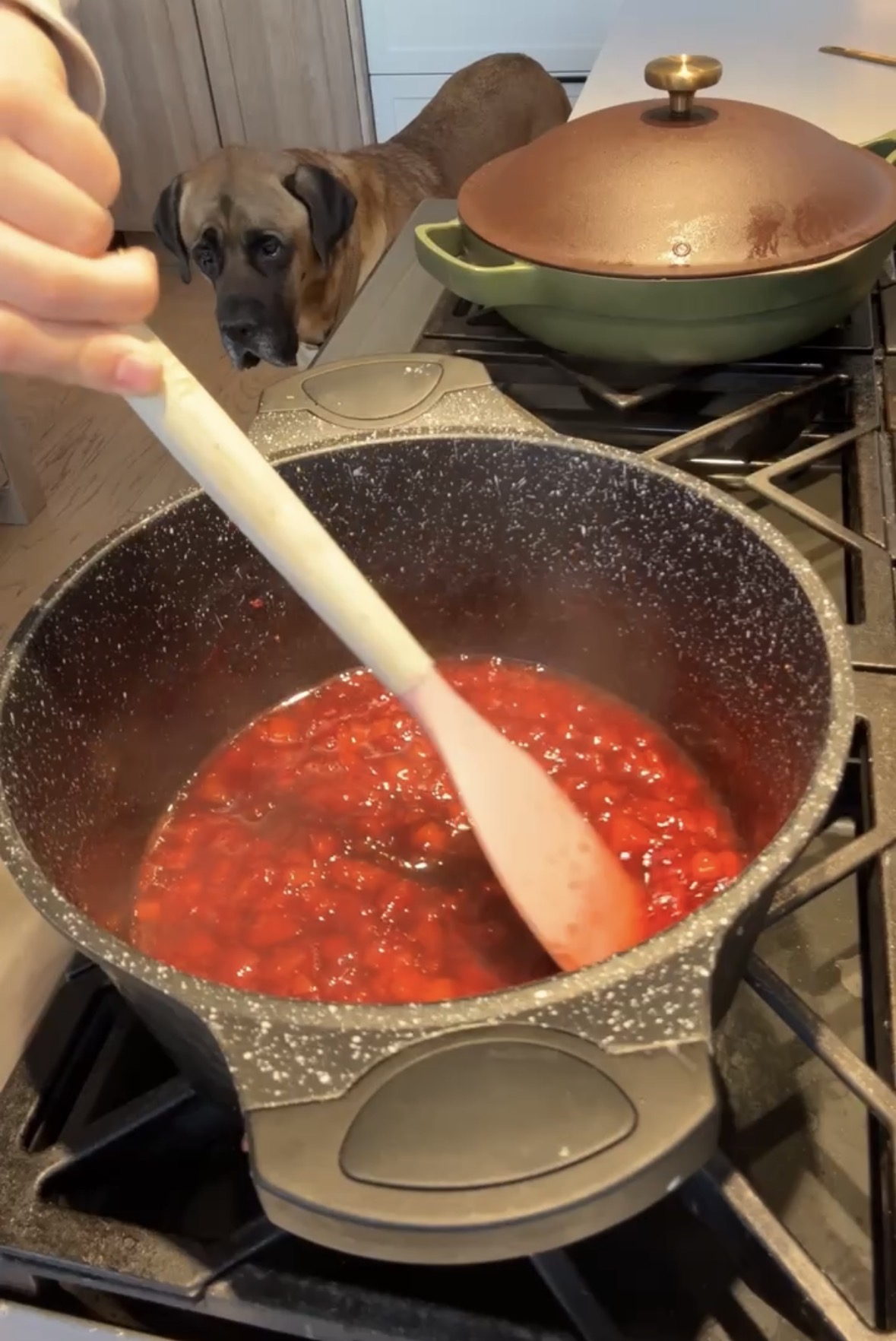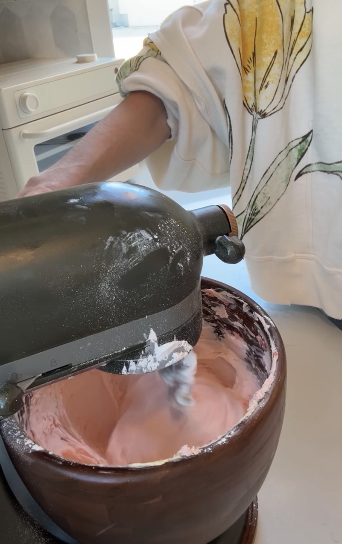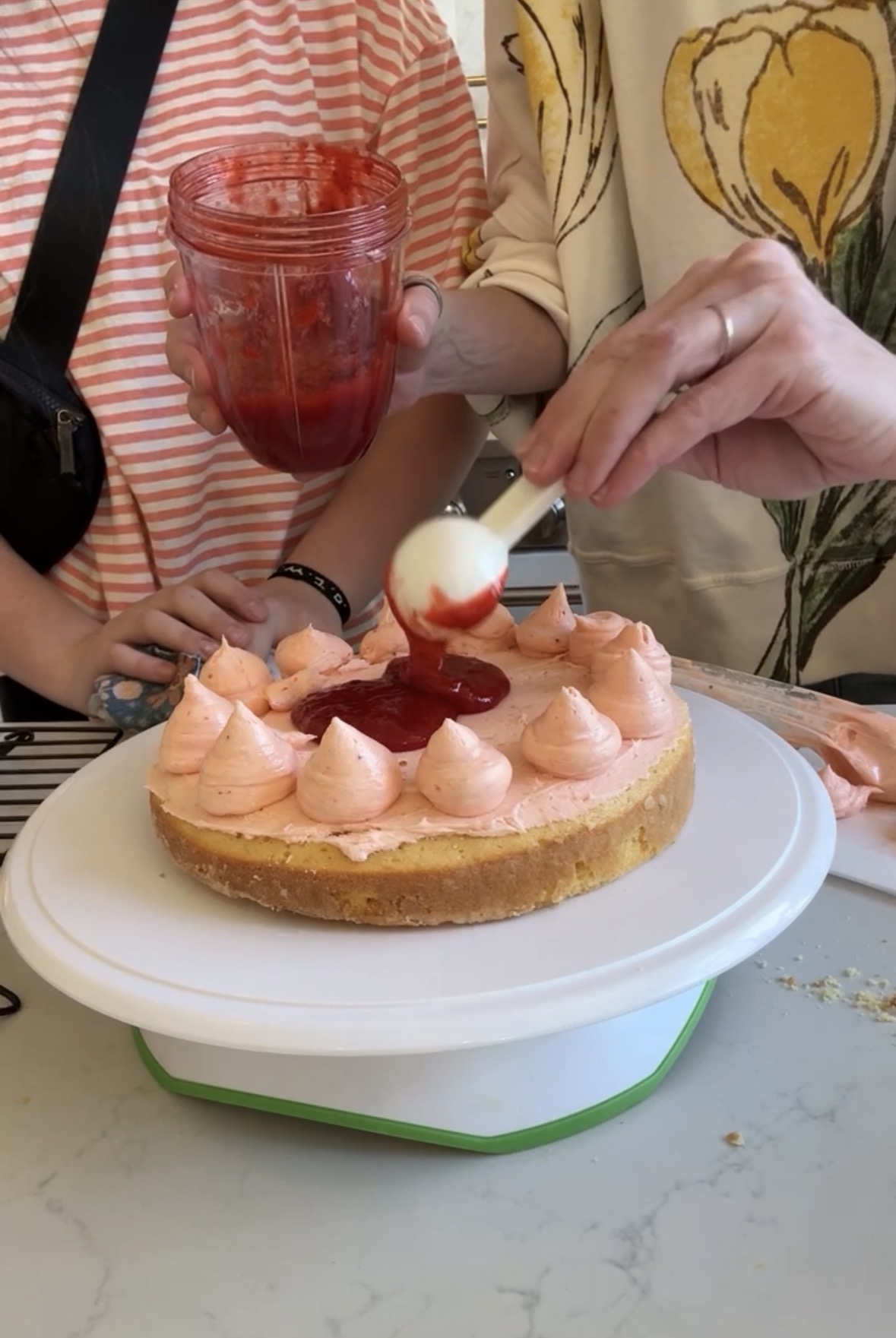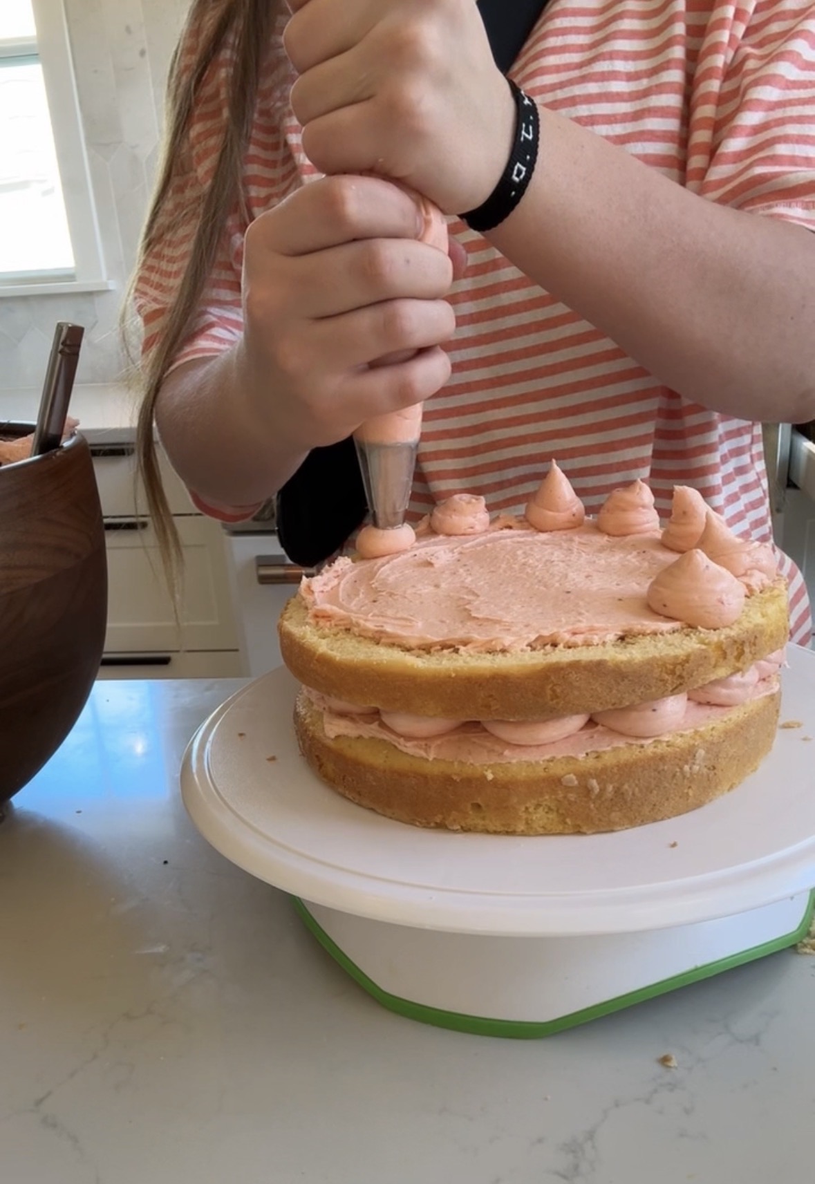 This was the best part! We decided to add “dollops” along the edges using a piping bag and round tip, and then put the strawberry reduction in the middle, and we did this for each layer EXCEPT for the top layer. We realized the frosting doesn’t pipe well on top of the reduction, so we didn’t add it to the top layer.